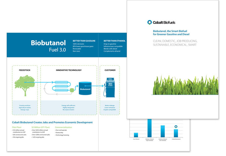 CONTRIBUTION Cobalt is a biofuels start-up and needed material for their investor presentations. The brochure had to communicate their unique distilling process and why it was worth investing in. The main challenge was the information graphic explaining this process. What was once a complex collage of photographs, line drawings, and text turned into a simple graphic story anyone could understand.